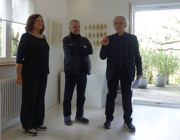 Galerist Werner Zaiß stellt den Vernissagegästen Hannelore Weitbrecht und Norbert Klaus vor.Foto: Wolfgang Nußbaumer