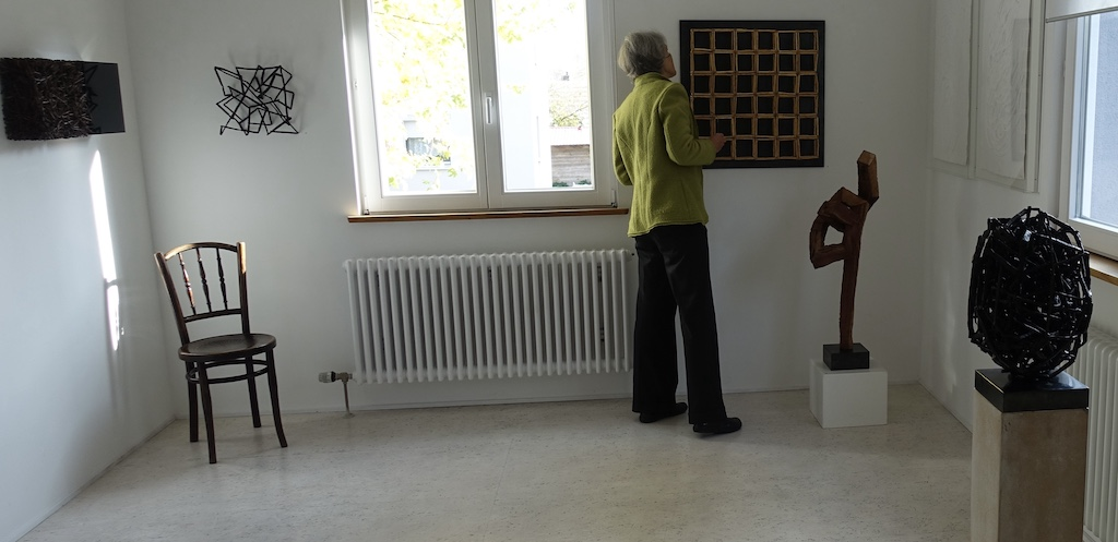 Die Bildhauerin Wiebke Bader aus Aalen studiert ein Wandobjekt des Kollegen Norbert Klaus.Foto: Wolfgang Nußbaumer